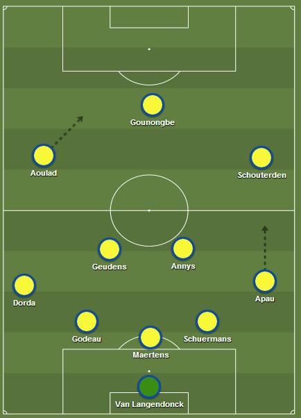 Als Van Wijk kiest voor een 5-mansdefensie is er centraal plaats voor Godeau (links) en Schuermans (rechts). Tussen, of eerder achter, hen leidt Maertens als een ouderwetse laatste man de defensie. Godeau & Schuermans zijn meer de mandekkers, Maertens speelt op ervaring de ruimte naast en achter hen, recupereert veel ballen dankzij zijn ervaring en goed positiespel. Opvallend is ook dat bij de 5-2-3 opstelling de opbouw bij Westerlo erg vlot verloopt. Wanneer de tegenstander niet hoog durft pressen (wat behalve Moeskroen weinig teams durven doen), komt Westerlo er voetballend meestal mooi uit. Op de flanken is er plaats voor Apau (rechts) en Dorda (links). Vooral Apau speelde zich al in the picture met uitstekende ruches die dankzij z’n snelheid en steeds een potentieel gevaar zijn. Wanneer Westerlo met 4 achterin speelt, sneuvelt Godeau of Dorda.