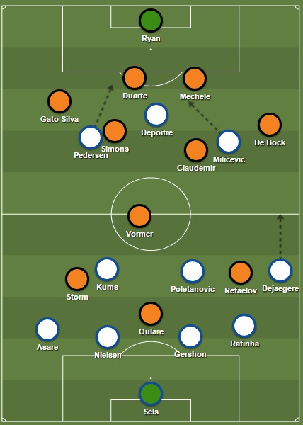 Preud’homme moest puzzelen en koos voor een 4-3-3: Ryan in doel; De Bock, Mechele, Duarte en Gato Silva in de verdediging. Daarvoor vormden Simons, Vormer & Claudemir de driehoek op het middenveld, voorin moesten Oulare, Refaelov en Storm voor gevaar zorgen.