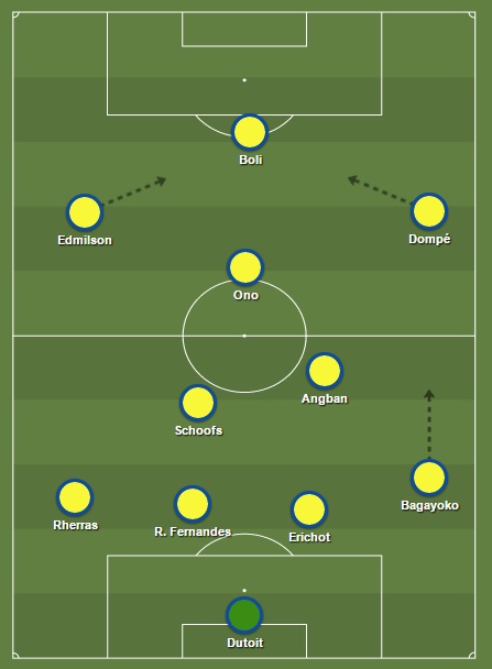 Ferrera kiest voor een 4-2-3-1 opstelling. In doel verraste de Fransman Dutoit in positieve zin. Hij toonde zijn uitstekende reflexen en uitvoetballend vermogen al meermaals en verdient de voorkeur op Yves De Winter.
