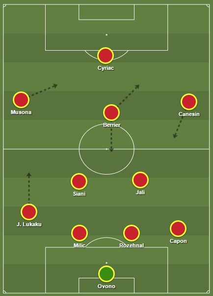 Over links is ook een duidelijk patroon merkbaar: daar kiest Musona er steeds voor om naar binnen te lopen, dicht bij de diepe spits. Lukaku bespeelt die ruimte en neemt de volledige linkerflank voor zijn rekening. Hij is vooral gevaarlijk als de bal met een snelle wisselpass van kant veranderd wordt. Lukaku kan dan zorgen voor de (vroege) voorzet, al dan niet na een individuele actie.