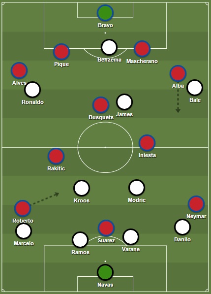 Barcelona ging uiteraard voor een verzorgde opbouw van achteruit bij doelman Bravo. Centrale verdedigers Pique en Mascherano (al snel geblesseerd uitgevallen en vervangen door Mathieu) zakten erg diep uit om de bal op te vragen bij de doelman. Busquets maakte zich voor de defensie uitstekend aanspeelbaar en hielp om de bezoekers uit de Madrileense druk te voetballen.
