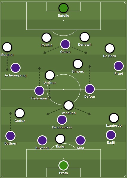 Besnik Hasi had de laatste weken kopzorgen met tal van belangrijke spelers die geblesseerd waren, maar de coach van Anderlecht recupereerde heel wat namen voor de clash van vandaag. Dendoncker en Najar kwamen zelfs meteen aan de aftrap in een 4-3-3 (met de punt naar achter) met volgende invulling: Proto; Buttner, Nuytinck, Kara, Najar; Dendoncker, Tielemans, Defour; Praet, Acheampong, Okaka. Najar moest echter al snel opnieuw (na 15’) naar de kant met een blessure.