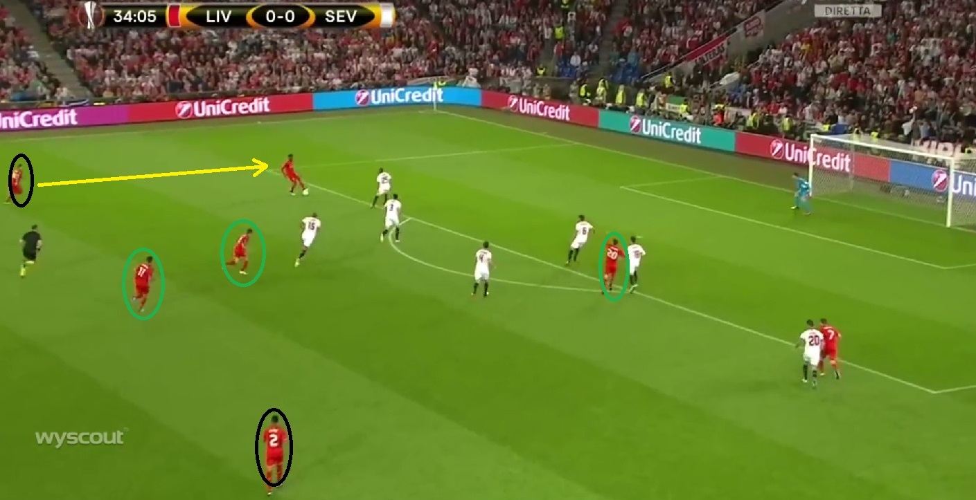 Sevilla liet zich van zijn kant iets te makkelijk indrukken, vooral beide flankaanvallers trokken zich te laag terug waardoor Liverpool de tijd kreeg om aan aanvallen te bouwen en zo ook de lopende Clyne & Moreno in stelling te krijgen.