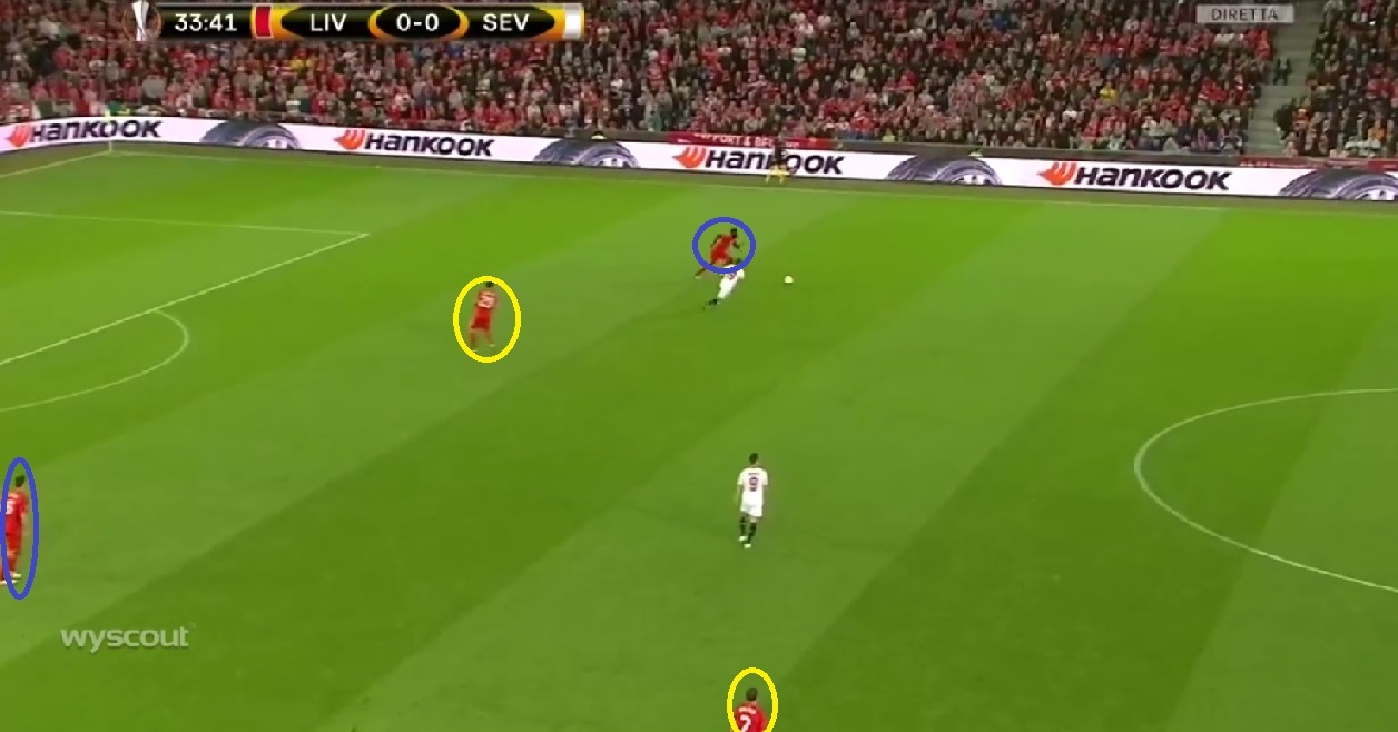 Liverpool probeerde op de eigen helft steeds een man-meersituatie te creëren in de achterste linie. Beide centrale verdedigers van The Reds werden vastgezet door Banega & Gameiro, waardoor Emre Can zijn verdedigers centraal te hulp schoot. Ook Milner was vaak terug te vinden als halve rechtsachter. Intussen schoven beide backs, Clyne en Moreno, hoog op om ook de flankaanvallers van Sevilla achteruit te lokken. Dit lukte regelmatig waardoor Liverpool iets meer tijd kreeg aan de bal.