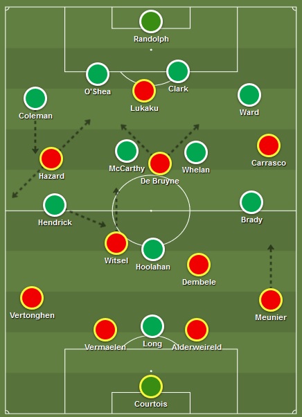 Ierland staat in 4-4-1-1 geposteerd en Long staat op een eiland. België met Witsel & Dembele erg hoog meteen klaar om vooruit te pressen bij eventueel balverlies