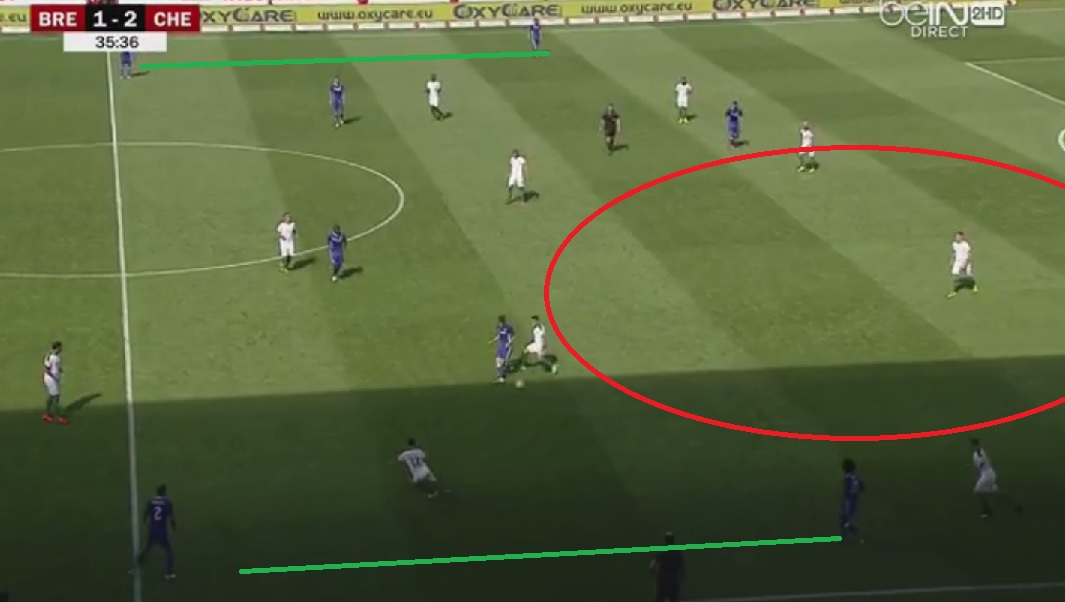 Flankaanvaller Willian zakt laag terug om back op te vangen waardoor formatie meer weer heeft van 5-4-1.