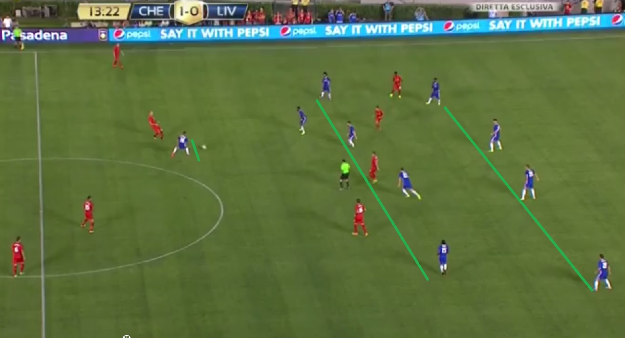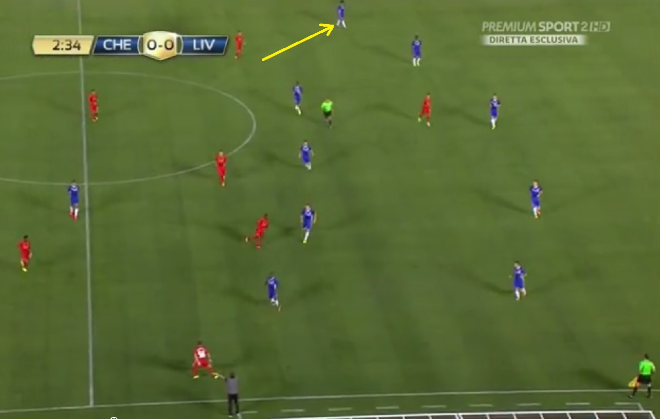 De flankaanvaller, vooral Willian op rechts, was op zijn beurt dan weer vaak verplicht om helemaal terug te zakken indien zijn rechtstreekse tegenstander, de back, oprukte. Die werd dus niet in zone opgevangen, wel man op man. Daardoor positioneerde Chelsea, eens het lange tijd de bal niet had, zich regelmatig in een lage 5-4-1. De back van Chelsea dekte steeds door op eventueel afhakende aanvallers, terwijl de eigen flankaanvaller dus een grote inspanning moest doen om die ruimte achterin op te vullen. Wanneer deze z’n tegenstander toch liet lopen, werd hij opgevangen door de verdedigende middenvelder of centrale verdediger.