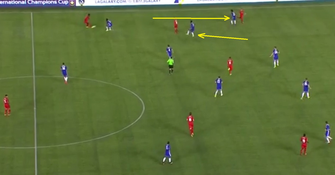 Opkomende back wordt niet in zone opgevangen. Willian zakt laag terug, back van Chelsea dekt door op afhakende aanvaller van Liverpool