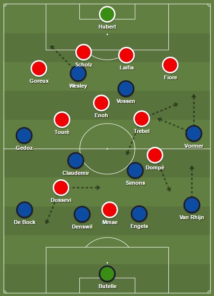 Dossevi kreeg een gelijkaardige rol al mocht hij iets hoger op het veld blijven in balverlies. Hij hield Claudemir van op een afstand dan wel in de gaten maar zijn belangrijkste taak was om de bal tussen de linies te vragen bij balrecuperatie of in de diepte te duiken om meteen gevaar te creëren. Diepe spits Mmae paste zich aan om de bal dan te vragen waar zijn ploegmaats niet op tijd in gevaarlijke posities geraakten.