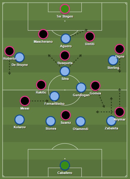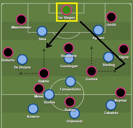 Net als twee weken terug koos City voor een aanpak met veel lef en bijhorende hoge pressing. Van zodra Barçadoelman Ter Stegen de bal in het spel wilde brengen, probeerden de Engelsen het hoog vast te zetten. Aanvallende middenvelder Silva kwam naast Aguero voetballen in balverlies en zij moesten de centrale verdedigers (Umtiti en Mascherano), doelman (Ter Stegen) en verdedigende middenvelders (Busquets) van de bezoekers het voetballen proberen beletten. Na tien minuten bleek dat al schier onmogelijk dankzij de technische superioriteit van de Catalanen en het uitstekende vrijlopen van Busquets. Barça was dan ook heer en meester van in de beginfase en eiste al het balbezit op.