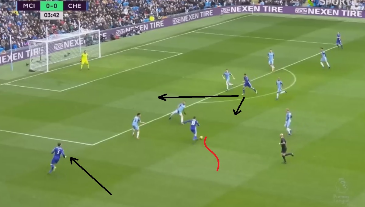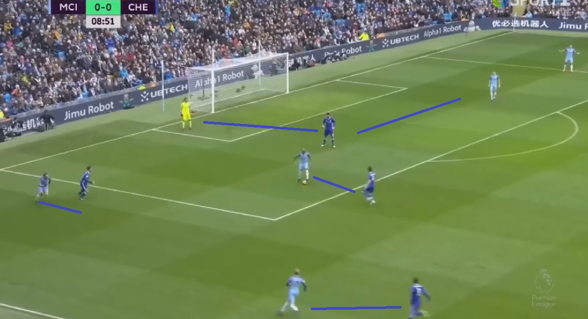 Man City probeert op te bouwen maar krijgt hoge pressing bij de doeltrap van Chelsea. Costa kiest positie tussen Stones en de doelman, terwijl elders op het veld wordt doorgedekt. Chelsea geeft echter ruimte weg in de rug die net niet wordt benut door City