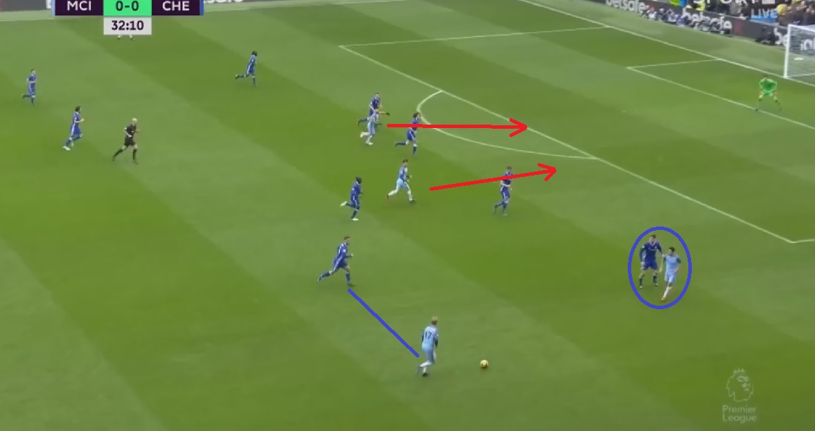 1. In het begin werden de infiltrerende Silva en De Bruyne vaak in een 1v1 situatie gebracht met Cahill die niet de meest wendbare is