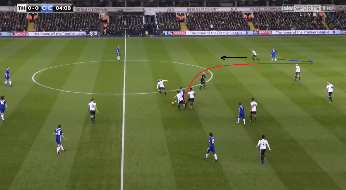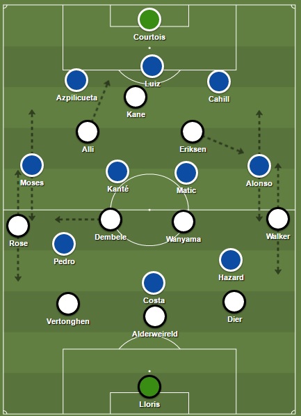 Door de wijziging van het systeem had het bijvoorbeeld steeds 3 centrale verdedigers over tegen de aanvallers van Chelsea. Daarnaast zorgden flankmiddenvelders/verdedigers Rose en Walker met hun enorme fysieke kracht ook vaak heel snel voor een 5-mansverdediging. In het eerste kwartier is er bijvoorbeeld al een fase waarin Hazard in balbezit komt op de counter maar waarbij de Spurs binnen de 5 seconden na balverlies al meteen met vijf verdedigers achter de bal staan dankzij de inspanningen van Rose & Walker.