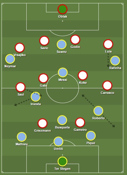 Wanneer Barcelona op links opbouwde via Mathieu was het bijvoorbeeld Saul die vooruit ging jagen, gesteund door zijn twee aanvallers op de verdedigers en doelman van de bezoekers. Iniesta herkende de situatie en liep zich dan vaak slim vrij in de rug van diezelfde Saul maar hij kon amper bereikt worden met een verticale pass langs de buitenkant. Gabi volgde hem overigens van dichtbij en Iniesta kon slechts een handvol keren de bal ingespeeld kregen, waarna hij geen kant op kon want hij stond vanzelfsprekend met de neus naar het eigen doel gericht. Busquets werd meestal ook van heel kortbij gevolgd door Carrasco of Koke waardoor Atlético in de openingsfase vaak de bal kon veroveren en dreigen richting doel van Barcelona. Ook de twee spitsen van de thuisploeg werkten keihard mee in balverlies waardoor Busquets amper in z’n spel geraakte.