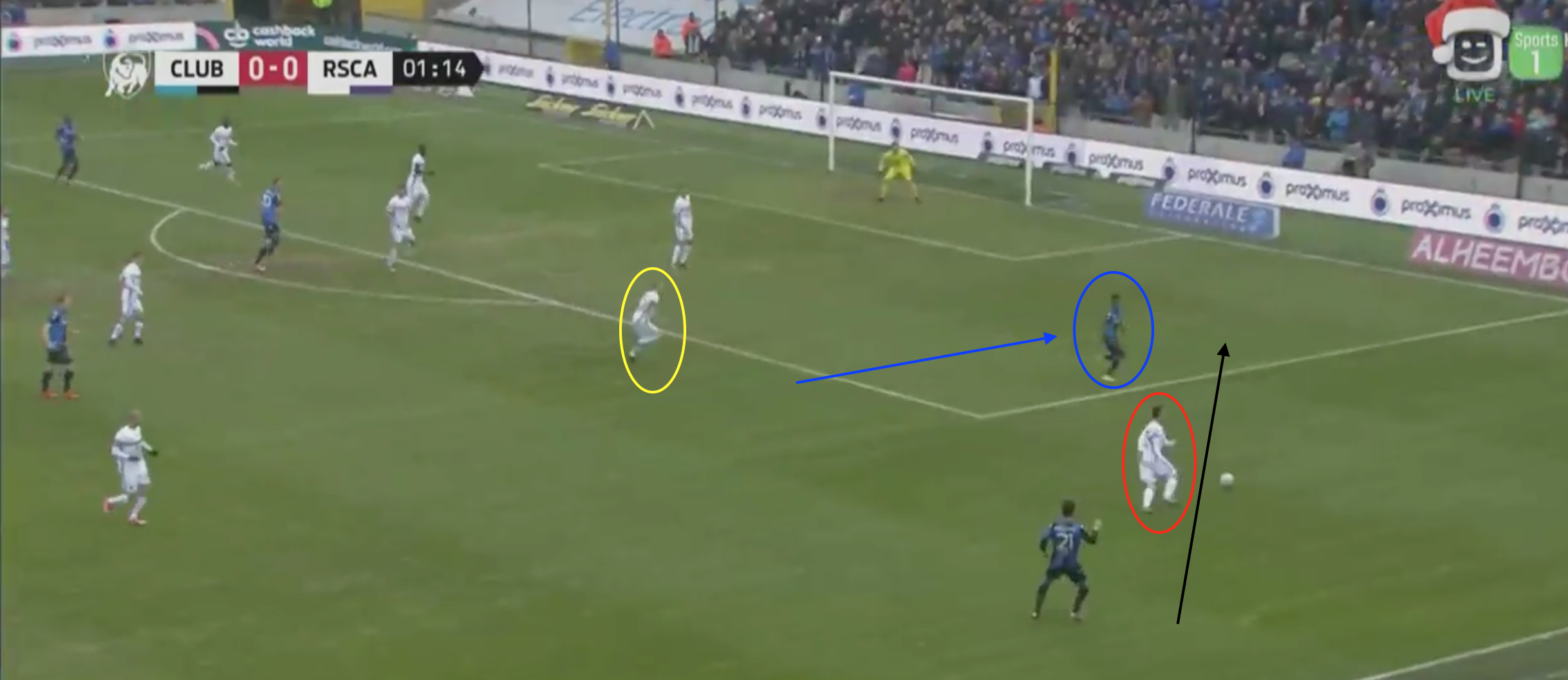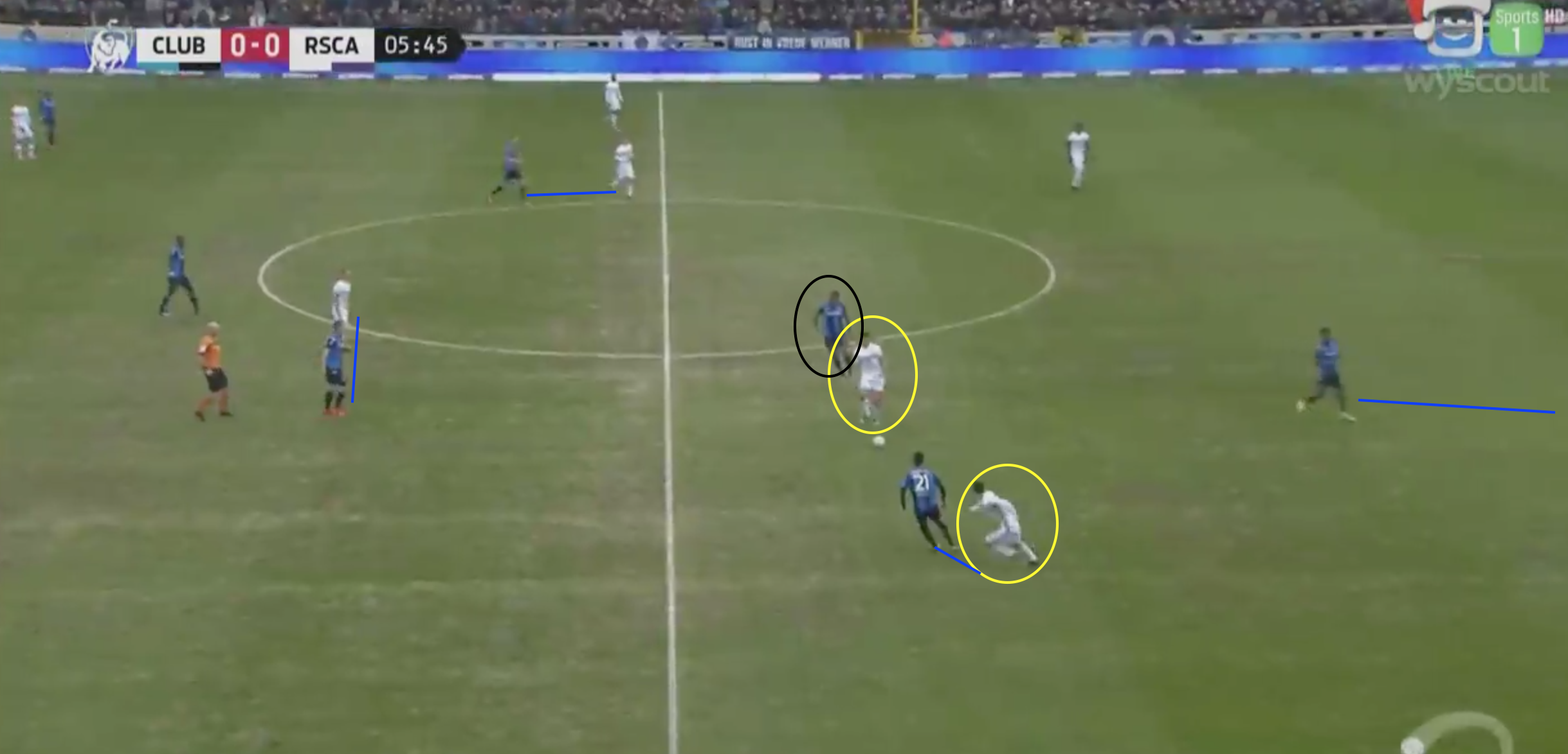 Hanni (geel links) duwt door op Poulian, terwijl Gerkens (geel rechts) Nakamba opvangt. Beric (zwart) houdt Mechele in de gaten. Obradovic (rood) drukt door op Cools wanneer mogelijk