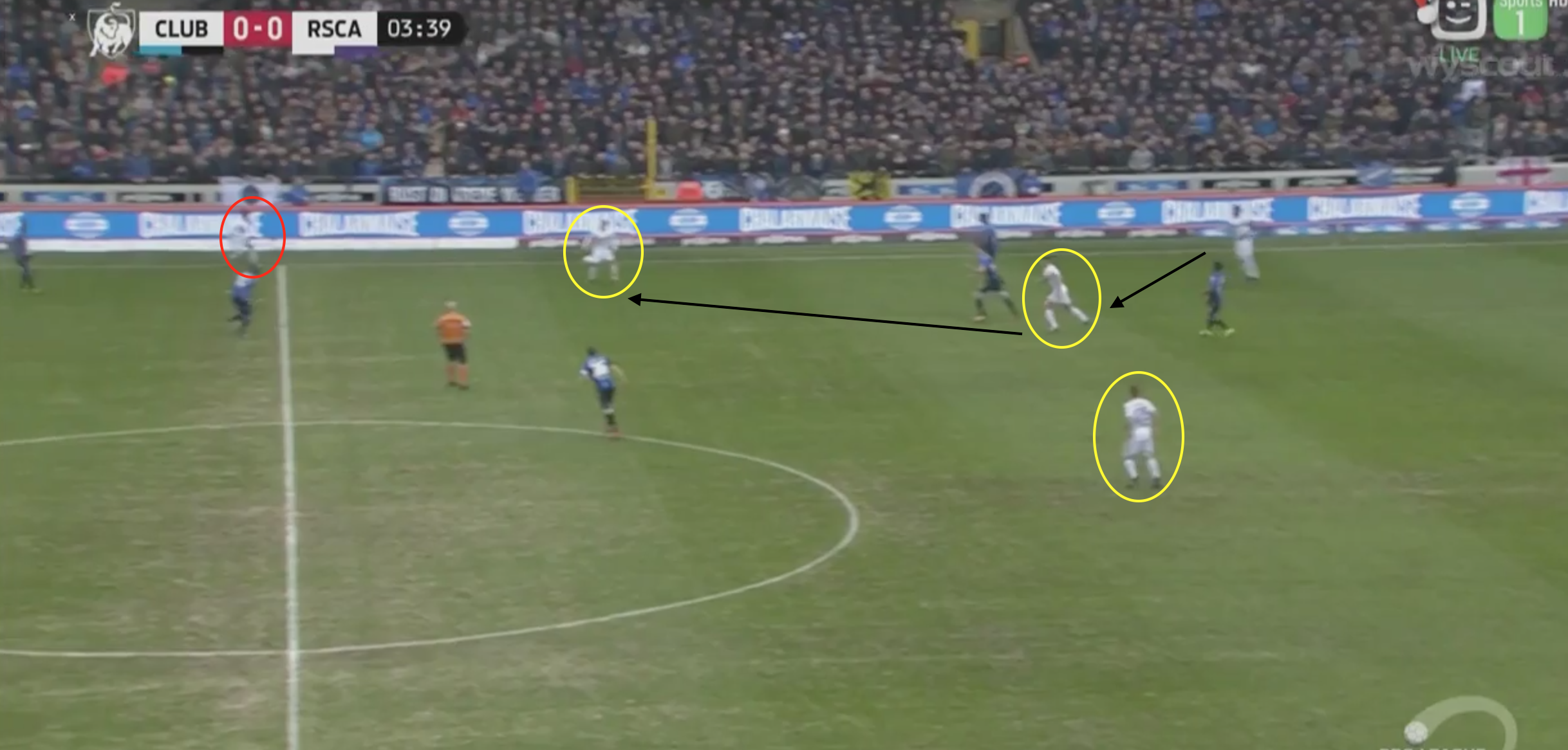 Anderlecht creëert overtal op het middenveld door Kums, Dendoncker en Trebel (geel) relatief laag te houden. Kums kan breed vrij komen door de hoge positie van Appiah (rood) en Nakamba twijfelt om door te dekken. Als hij dat doet, geeft hij ruimte aan Gerkens & Hanni om af te haken
