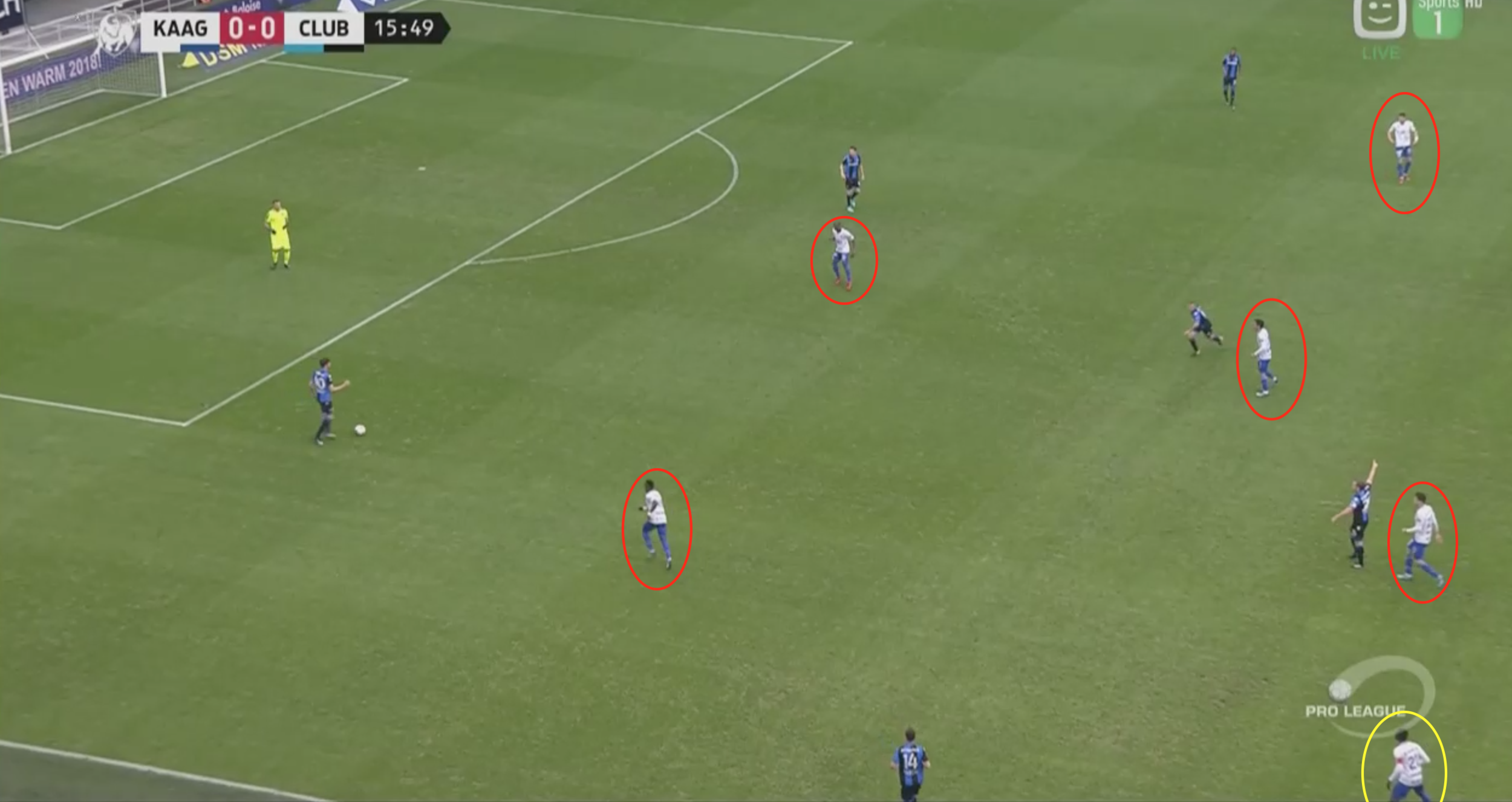 Gent leidt de opbouw eerst naar de linkerkant bij Asare. Vormer (zwart) komt drukzetten vanuit het middenveld maar is relatief lang onderweg vanwege de afstand. Ondertussen zorgen de Brugse spitsen (blauw) dat de Gentse middenvelders de bal niet kunnen krijgen. De centrale verdedigers zijn volledig vrij en kunnen zonder druk de bal van kant wisselen om een 1v1 of 2v1 op rechts te creëren bij Kalu en/of Foket (rood)