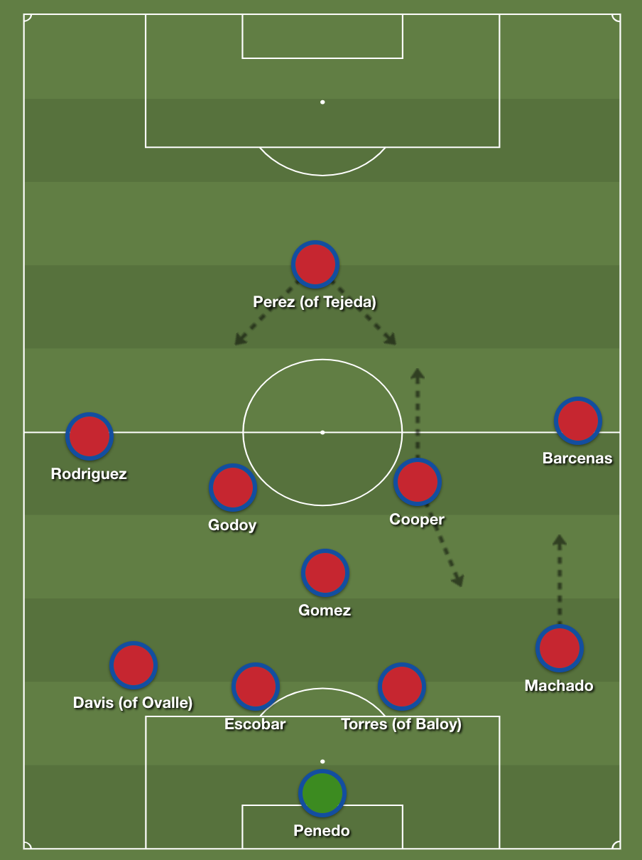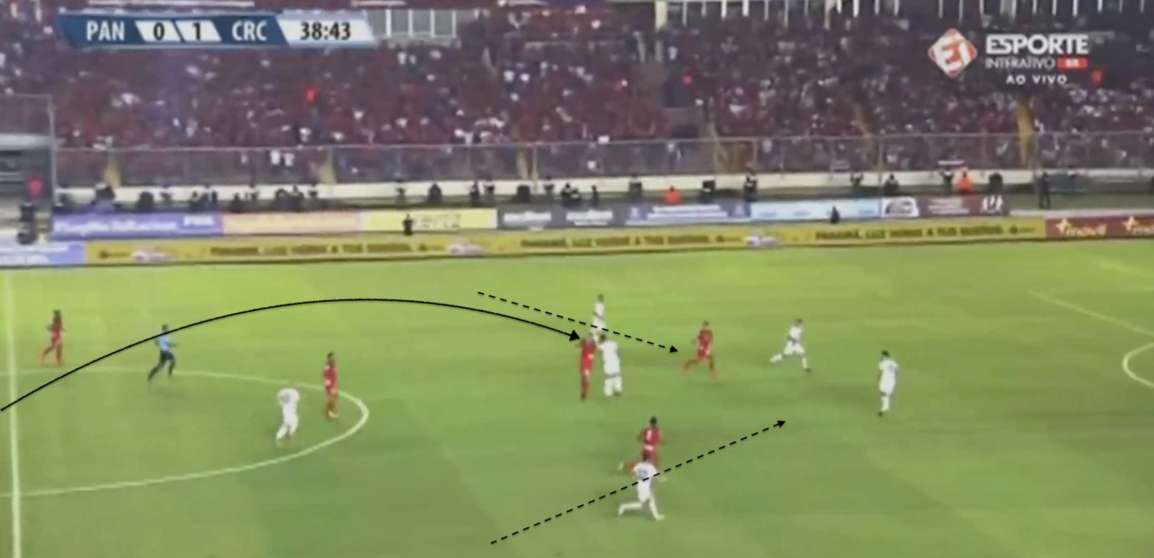 Lange bal van achteruit op diepe spits Perez. Twee ploegmaats anticiperen op het kopduel en lopen door in de diepte, G. Torres komt alleen voor de Costa Ricaanse keeper maar mist