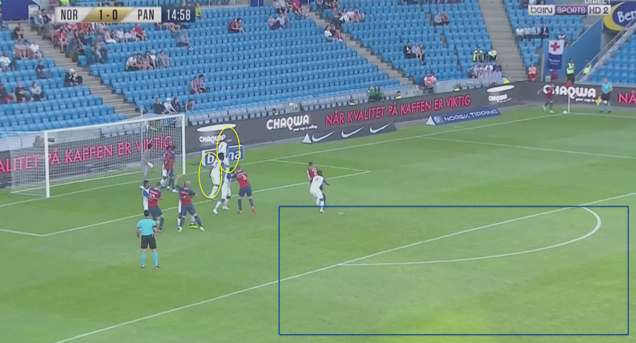 Aangezien de individuele kwaliteit en het aanvalsplan redelijk beperkt is, moet Panama proberen gebruikmaken van elke standaardsituatie om tot gevaar te komen. Het eerste wat daarbij opvalt, is het frequente gebruik van de (heel) verre inworp. Deze komt van rechtsback Machado en wordt zowel op rechts als op links gebruikt. Er zijn zelfs situaties waarbij de verre inworp van zo’n 30m wordt gebruikt aan de middenlijn richting de targetspits die rond de baklijn beweegt. Rond hem zijn tegelijk voldoende lopende spelers die voor chaos proberen zorgen.