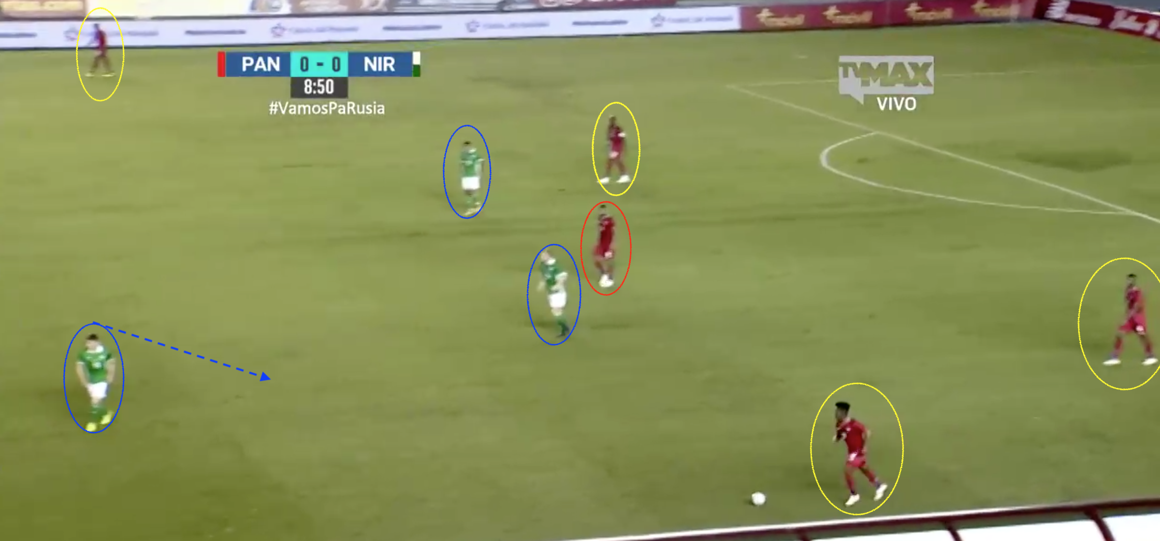 (Te?) Groot overtal in de opbouwfase: 4 Panamese verdedigers (geel) en 1 middenvelder (rood) tegen 3 Noord-Ierse spelers (blauw). Door te trage balcirculatie verloopt het spel echter erg voorspelbaar en gaat de bal verloren tussen de linies
