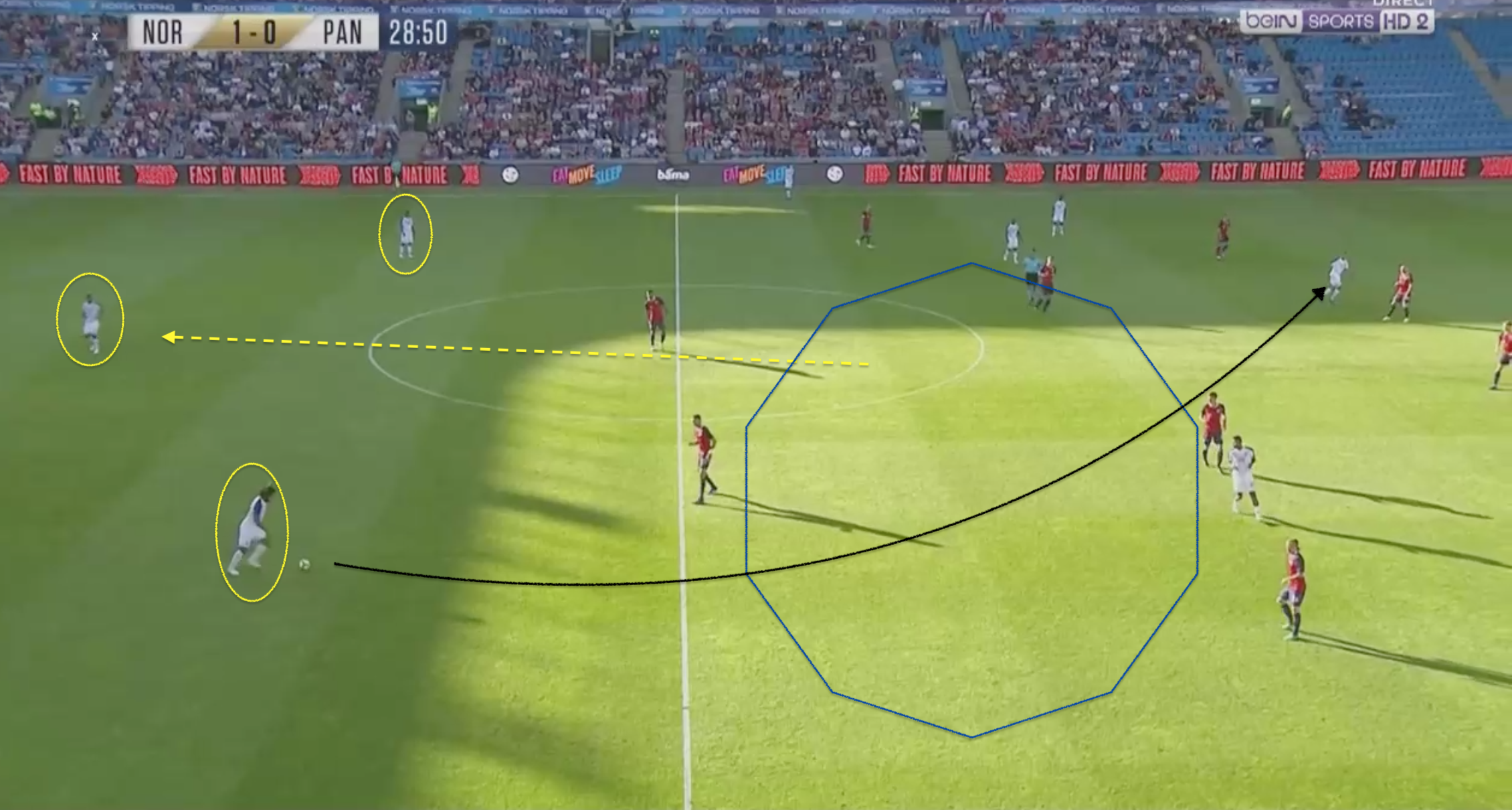 De tweede manier van opbouwen is snel de ‘kortste weg naar doel zoeken’, lees een snelle lange bal richting de aanvallers. In de beslissende WK-kwalificatiematch tegen Costa Rica en de oefenwedstrijd tegen Denemarken koos Panama duidelijk voor die tweede strategie. Gezien de beperkte kwaliteiten aan de bal bij de Panamezen lijkt dit, minder risicovol scenario, mogelijks het meest logische voor coach Gomez.
