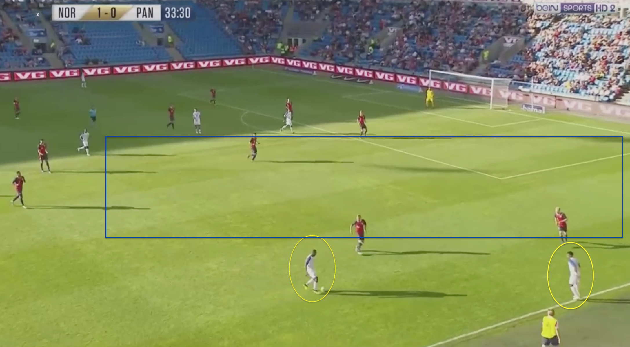 Tegen de Noren een gelijkaardig verhaal. Noorwegen speelde in een 4-4-2 systeem waardoor Panama de 6 (nu Gomez) achteruit trok om tussen de centrale verdedigers een 3v2 situatie te creëren. De positie van de backs was echter vaak onvoldoende hoog om ruimte te maken voor andere ploegmaats. Bovendien zorgde, eigenlijk in alle wedstrijden, de te lage balsnelheid voor heel voorspelbaar getik achterin zonder dat er directe diepgang mogelijk was. De tegenstander kon Panama vaak dwingen in een risicovolle pass tussen de linies die makkelijk werd onderschept. Wanneer de Panamese centrale verdedigers toch een aanvallende middenvelder of flankaanvaller tussen de linies konden bereiken, verloor deze meestal de bal door een te beperkte technische bagage met een gevaarlijke tegenaanval tot gevolg.