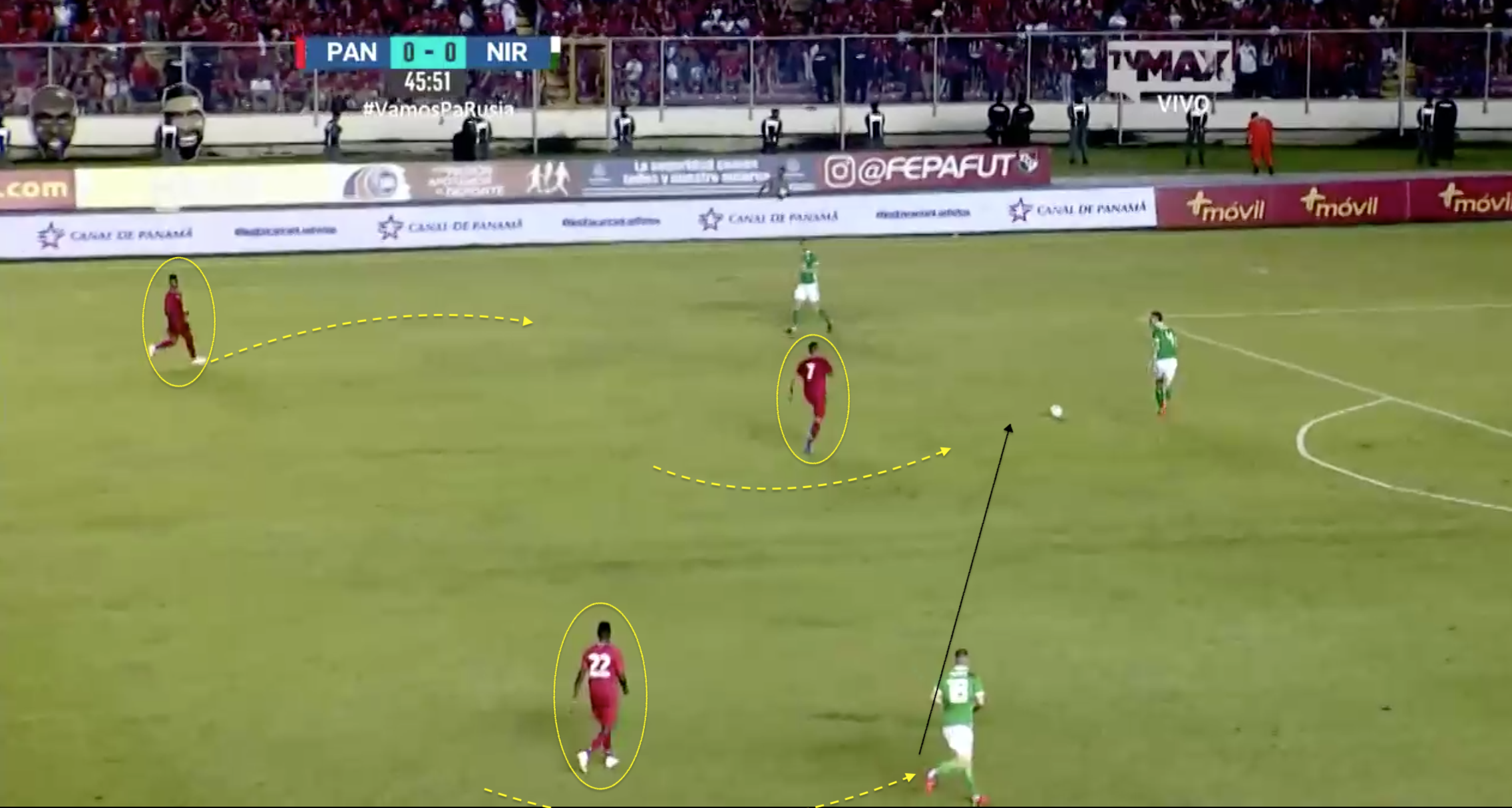 Soms kozen de Panamezen echter wel voor agressieve pressing op de 3-mansdefensie. Meestal was het dan één van beide flankaanvallers die z’n moment koos om hoog door te duwen op de linker- of rechter centrale verdediger van de tegenpartij wanneer die een moeilijkere bal kreeg toegespeeld. Door hem naar binnen te duwen, vanuit de passlijn op de wing back, vond die weinig voorwaartse opties. Intussen drukte de spits door op de meest centrale verdediger en schoof ook de andere flankaanvaller door richting de derde centrale man. Vaak werd een centrale middenvelder wel vrijgelaten in die situaties maar de Noord-Ieren blonken op een slecht terrein niet meteen uit in hoog technisch vernuft waardoor het gedwongen werd snel lang te spelen. België moet wél in staat zijn om onder die mogelijke druk uit te voetballen.