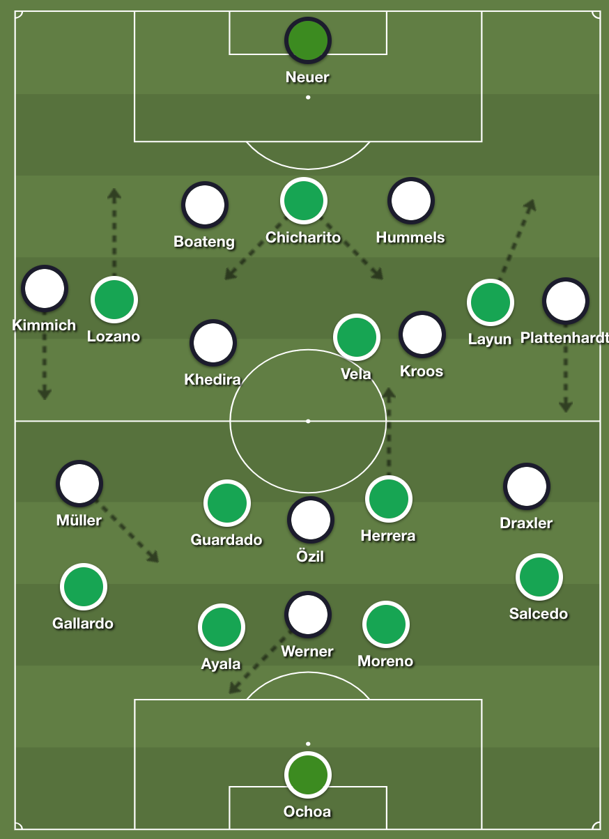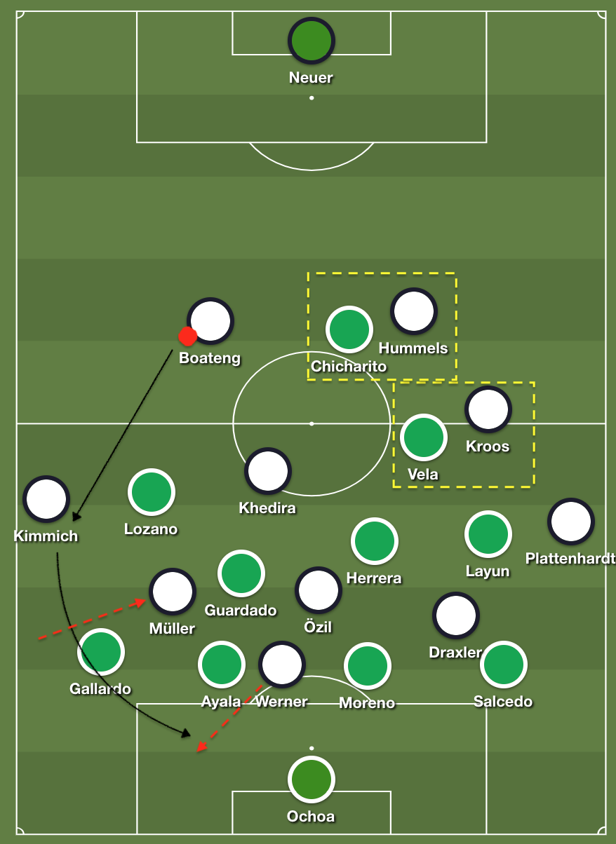 Kroos & Hummels werden onschadelijk gemaakt door respectievelijk Vela & Chicharito (gele rechthoeken) waardoor vooral Boateng en Khedira veel ruimte kregen. Overtal werd vooral op rechts gezocht via Boateng-Kimmich waarna Müller en Werner een goede wisselwerking hadden wat in de openingsfase gevaar opleverde