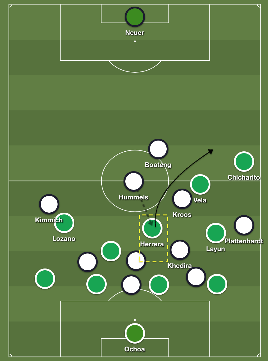 De Duitse aanval strandt voorin (in gele rechthoek), Khedira is mee ingeschoven. Restverdediging staat niet op punt: backs staan goed maar Kroos-Boateng-Hummels niet goed in positie. Bovendien gaat Hummels 15m gaan doordekken op Herrera. Diepe bal wordt verstuurd: Chicarito & Vela 2v1 tegen Boateng maar ze verkwanselen de kans