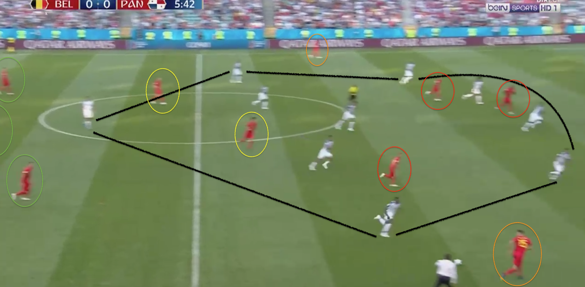 Hoe dan precies? België gaat al twee jaar uit van een aanvallend 3-4-3 systeem met duidelijke patronen en veel drang naar voor. Opvallend daarbij is dat het via de positie van de spelers uiteraard constant tegenstanders aan het twijfelen wil brengen. Veel spelers tussen de linies of die voor diepte zorgen (rood omcirkeld = gevaarlijkste spelers), spelers hoog naast het blok van de tegenstanders (oranje), ploegmaats in het blok van de tegenstander (geel) maar relatief laag en dus niet zo gevaarlijk en tot slot spelers laag buiten het blok van de tegenstander (groen: lees in eerste instantie ongevaarlijk).
