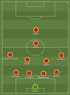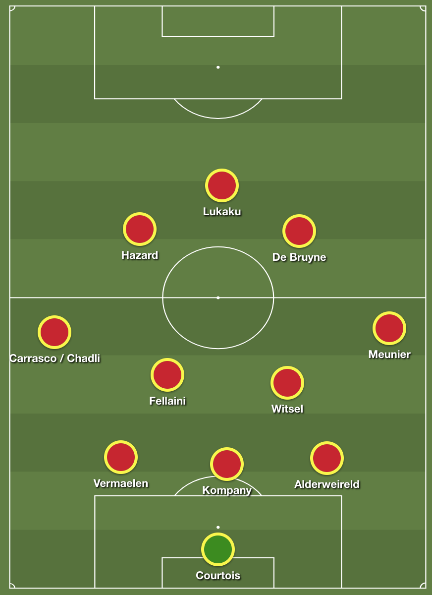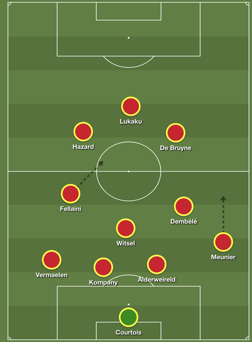 In ons eerste plan kiezen we in balbezit voor de huidige aanvalspatronen van onze Rode Duivels vanuit 3-4-3. Met het motto: wat goed is, moet behouden worden! Echter in balverlies, kiezen we voor een asymmetrische 4-3-3 zoals KAA Gent het destijds deed onder Hein Vanhaezebrouck: namelijk in balverlies meteen omschakelen naar een 4-mansdefensie mét een dubbele flankbezetting. Daarbij wordt Meunier de rechtsachter en geeft hij in de defensie steun aan Vermaelen, Alderweireld en Kompany. Chadli of Carrasco blijft dan iets hoger speler als linkermiddenvelder, terwijl De Bruyne rechtermiddenvelder wordt. Centraal voor de defensie kiezen we sowieso voor Witsel én Fellaini. Lukaku en Hazard kunnen dan hoger op het veld van meer vrijheid genieten en de Belgische counters inleiden.