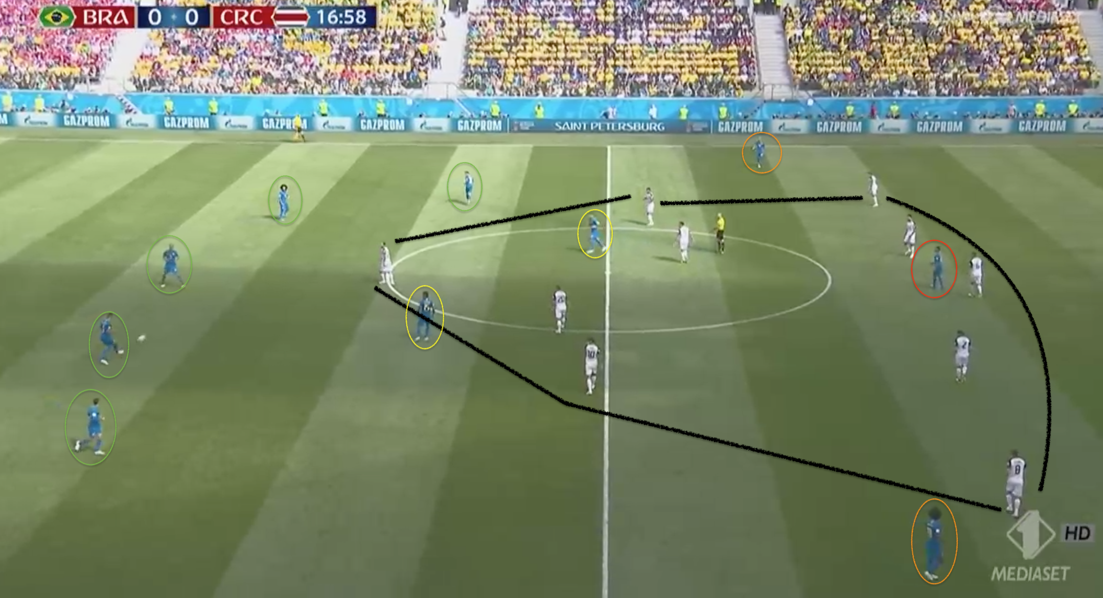 Los van (het blok van) de tegenstander is Brazilië hier gedurende het tornooi over het algemeen een stuk voorzichtiger in. Het gaat altijd uit van een 4-3-3 formatie maar onderstaande situatie is bijvoorbeeld geen uitzondering: 5 spelers in de laatste veilige lijn buiten het blok van de tegenstander komt geregeld voor. Het zorgt ervoor dat de twee flankaanvallers het veld breed houden (oranje) en er dus maar 1 echte gevaarlijke (rode speler) is die uiteraard makkelijk te verdedigen valt.