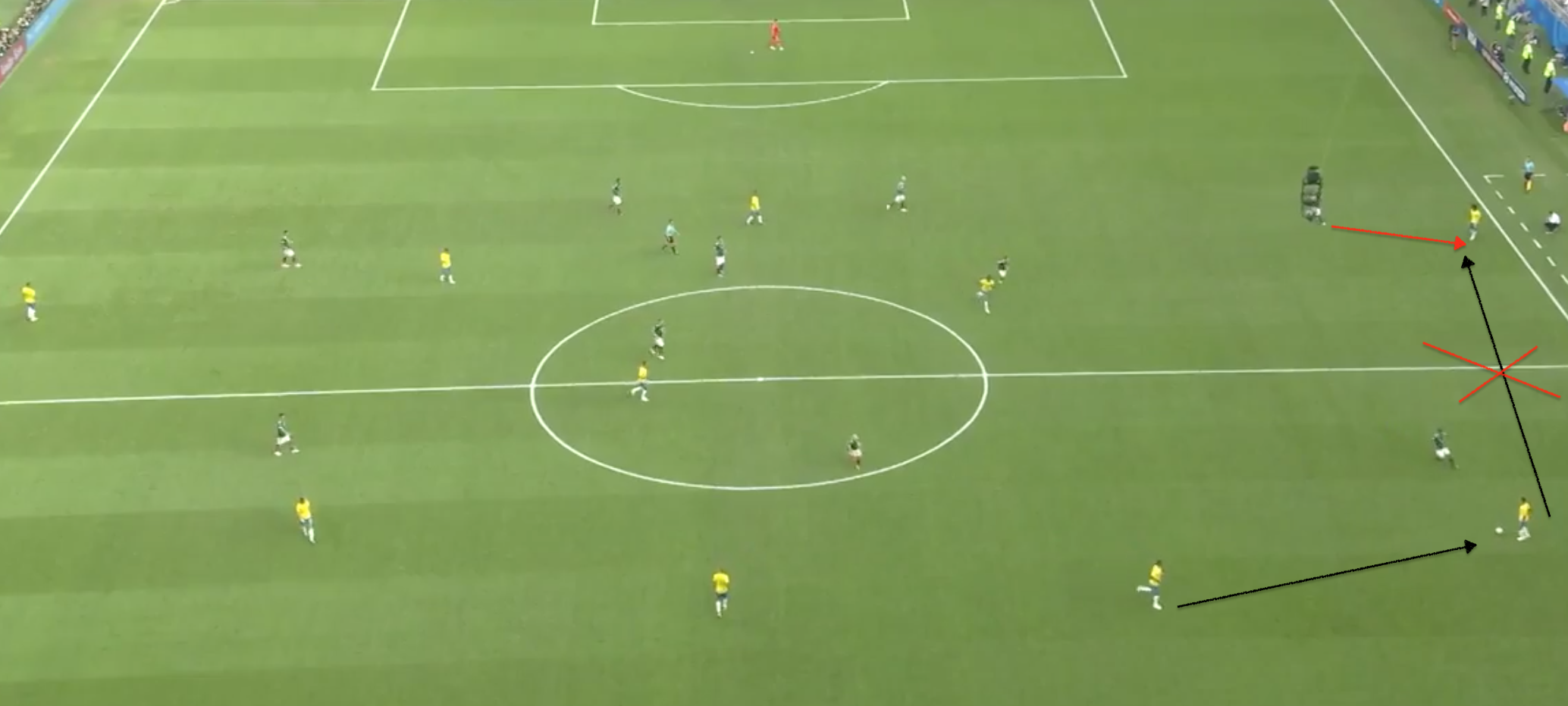 Een ander euvel binnen het aanvalsplan van Brazilië hangt daar nauw bij samen: de backs (vooral Fagner & Filipe Luis) zijn relatief beperkt in hun aanvalsdrift waardoor de wingers het veld breed houden en er dus weinig aanspeelopties komen in de ‘red zone’. Daardoor worden Neymar en Willian vaak aangespeeld in slechte omstandigheden: namelijk recht op recht langs de lijn terwijl ze kort gedekt worden. Zonder twijfel een belangrijke reden waarom Neymar steeds in het duel terecht komt en dus ook zo veel schoppen krijgt dit WK. Een matige positionele invulling van het elftal die je bij België maar nauwelijks zal zien, qua aanvallende structuur en visie doet dit WK niemand beter dan onze Belgen. Desondanks zijn de versnellingen van de Brazilianen vaak verschroeiend en zijn Willian, Neymar en Coutinho allen in staat de match met één verrassende flits in een beslissende plooi te leggen.