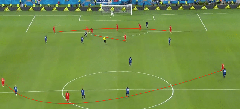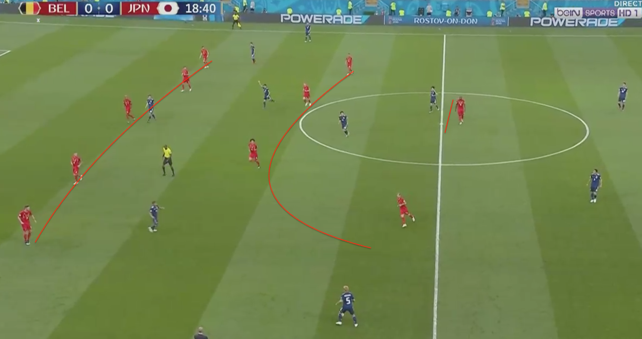Regelmatig zie je dan ook dat de Belgen gedurfd gaan gokken op de omschakeling waarbij het team in twee blokken lijkt uiteen te vallen, in een 5-2 achter de bal en 3 jongens voor de bal (Mertens, Hazard en Lukaku). Uiteraard dé reden waarom we zo gevaarlijk zijn in de omschakeling: vaak kwalitatieve spelers al in een hoge positie op het moment dat we de bal veroveren. Geen enkel ander land doet dit echter en zo zwaar gokken tegen de Brazilianen is waarschijnlijk geen goed idee. Marcelo, indien fit, laten oprukken op de linkerflank en met Neymar op Meunier laten afstormen is mogelijks zelfs suïcidaal te noemen. Japan probeerde dit tegen de Belgen al constant uit te spelen met de oprukkende Nagatomo en Inui tegen Meunier, wat meermaals tot gevaar leidde.