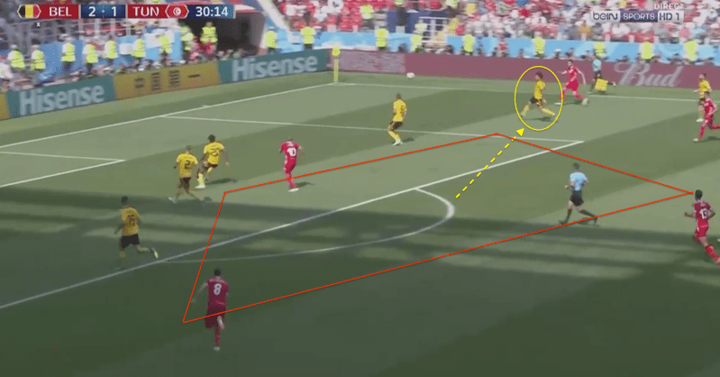 Witsel moet de 1v2 aan de buitenkant corrigeren om flankvoorzet eruit te halen, De Bruyne nergens te bespeuren. Centrale zone (rood) volledig vrij voor een bal achteruit naar inlopende tegenstanders
