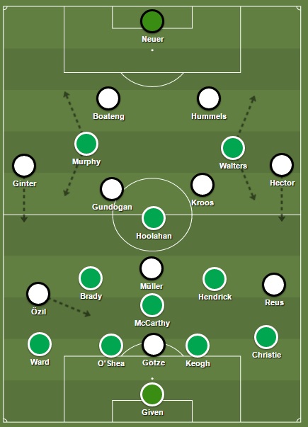Ook van de Ieren hoefden we weinig gevaar te verwachten. Hun strategie was even simpel als inefficiënt: snel de bal bij diepe spits Shane Long krijgen. De aanvaller van Southampton stond echter op een eiland omdat de Ierse vleugelaanvallers gedegradeerd werden tot lage flankmiddenvelders (zie bovenstaande foto). Daardoor kwam Long steeds in een 2-tegen-1 gevecht met Alderweireld en Vermaelen. Dat duo trok goed zijn streng want van de 23 kruisraketten (lees lange ballen, dieptepasses en verre inworpen) die de Ieren in de eerste 45’ (!) afvuurden naar Long, kon hij er slechts 6 in de ploeg houden. Over de hele match bekeken was meer dan 20% van de Ierse passes overigens een lange bal of een vroege voorzet.