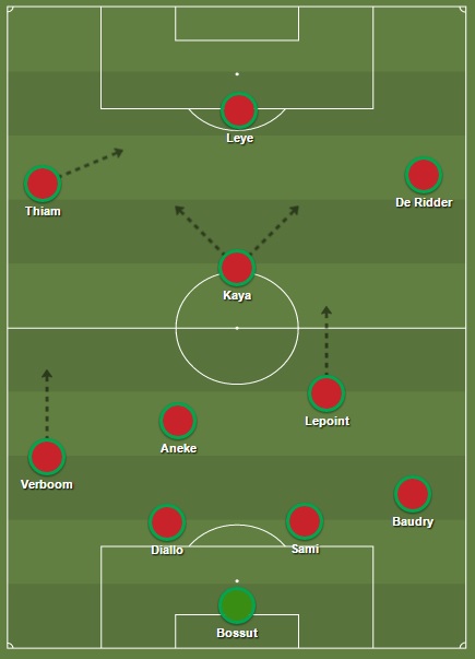 Francky Dury koos voor een 4-3-3 met Steppe; Verboom, Diallo, Lepoint, Baudry, Essikal, De Ridder, Kaya, Dalsgaard, Cordaro en Leye.